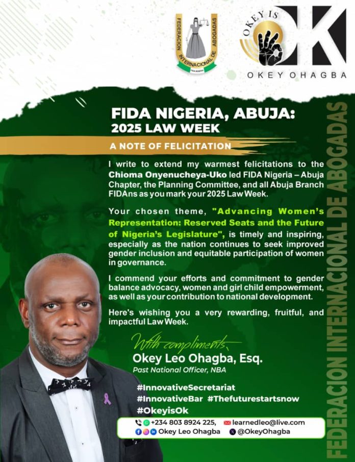 I write to extend my warmest felicitations to the Chioma Onyenucheya-Uko led FIDA Nigeria – Abuja Chapter, the Planning Committee, and all Abuja Branch FIDAns as you mark your 2025 Law Week.