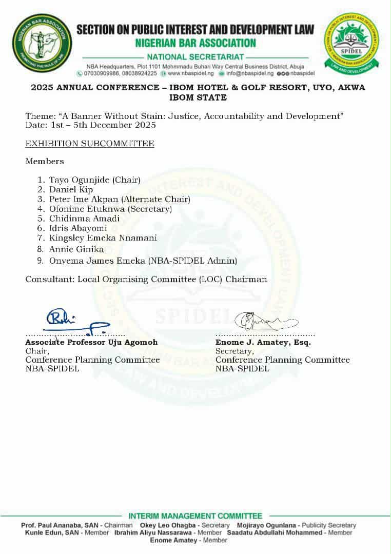 The Nigerian Bar Association Section on Public Interest and Development Law (NBA-SPIDEL) Conference Planning Committee (CPC) has set up a sub-committee to drive its exhibition programme for the 2025 Annual Conference.