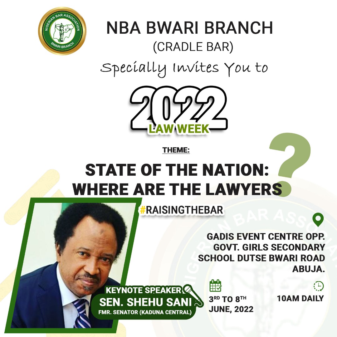 The Branch Chairman, Monday Adjeh and the 2022 Law Week Planning Committee Chair, Paul. B. Daudu both confirmed that the Law Week – whose theme is ‘STATE OF THE NATION: WHERE ARE THE LAWYERS?’ – will have as its Keynote Speaker, the distinguished Sen. Shehu Sani, ahead of panel discourses involving an equally distinguished faculty of speakers and resource persons.