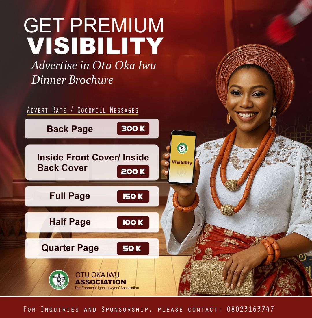 As Otu Oka Iwu prepares for its highly anticipated Annual Dinner & End-of-Year Celebration 2025, we are delighted to open up advertising opportunities in the official Otu Oka Iwu Dinner Brochure — a premium publication that will be circulated among distinguished legal practitioners, corporate executives, policymakers, and influential members of the Igbo legal community.