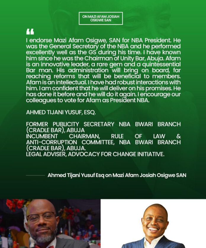 Legal Adviser, Advocacy for Change Initiative, Mr. Ahmed Tijani Yusuf, Esq. endorses Mazi Afam Josiah Osigwe, SAN for NBA President