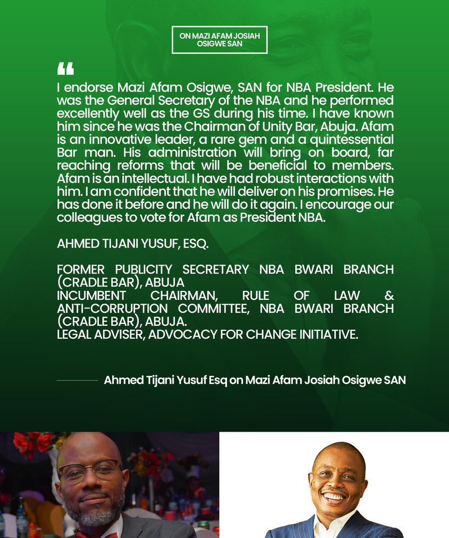 “I endorse Mazi Afam Osigwe, SAN for NBA President. He was the General Secretary of the NBA and he performed excellently well as the GS during his time. I have known him since he was the Chairman of Unity Bar, Abuja. Afam is an innovative leader, a rare gem and a quintessential Bar man. His administration will bring on board, far reaching reforms that will be beneficial to members. Afam is an intellectual. I have had robust interactions with him. I am confident that he will deliver on his promises. He has done it before and he will do it again. I encourage our colleagues to vote for Afam as President NBA.”