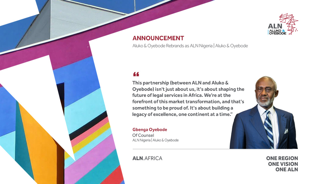 ALN Nigeria | Aluko & Oyebode’s rebranding marks a significant milestone in the Firm’s thirty year journey and reinforces its renewed commitment to ensuring clients success as they navigate Africa’s emerging order. Across Africa, economic dynamics present a mix of opportunities and growth factors, including rapid urbanisation and a growing youthful population. These demographic trends, coupled with the continent’s vast resources and increasing economic integration, create significant potential for investmentIn response to the dynamic business landscape in Africa, ALN Nigeria | Aluko & Oyebode has evolved into a contemporary, approachable and knowledgeable alliance of trusted advisors, fully attuned to the demands of the digital age.