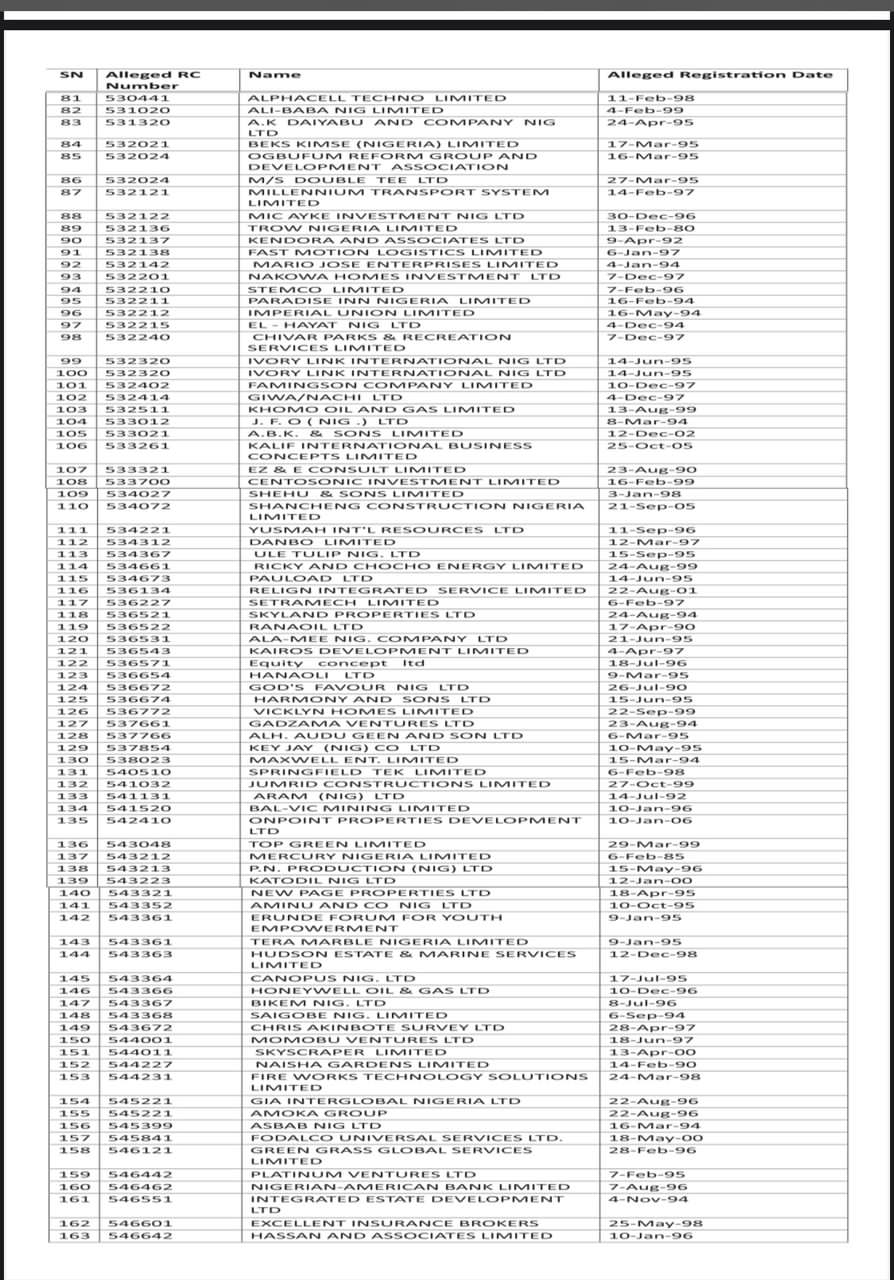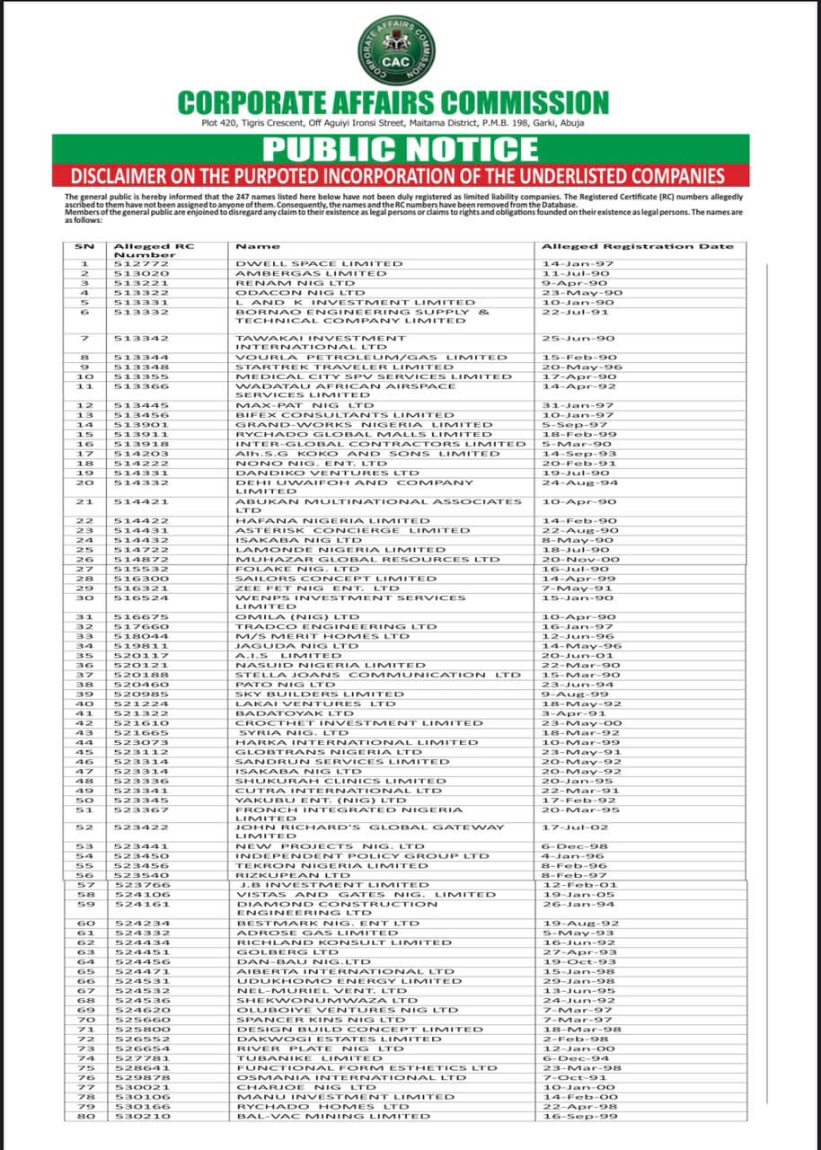 The Corporate Affairs Commission, CAC, has a issued a disclaimer on the purported incorporation of some listed companies.