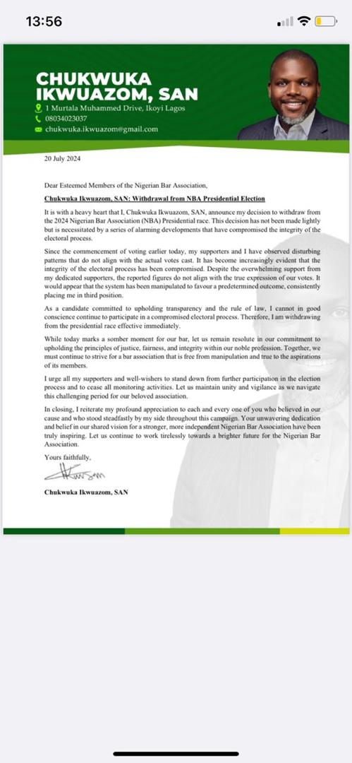 In a shocking turn of events, Chukwuka Ikwuazom, SAN, a leading candidate in the 2024 Nigerian Bar Association (NBA) Presidential election, has announced his withdrawal from the race. The announcement came on July 20, 2024, following the commencement of voting earlier in the day.