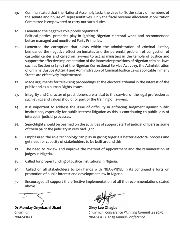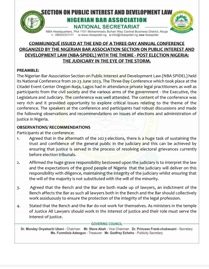 The Nigerian Bar Association Section on Public Interest and Development Law (NBA SPIDEL) held its National Conference from 20-23 June 2023. The Three-Day Conference which took place at the Citadel Event Center Oregon-Ikeja, Lagos had in attendance private legal practitioners as well as participants from the civil society and the various arms of the government – the Executive, the Legislature and Judiciary. The conference was well attended. The content of the conference was very rich and it provided opportunity to explore critical issues relating to the theme of the conference. The speakers at the conference and participants had robust discussions and made the following observations and recommendations on issues of elections and administration of justice in Nigeria.