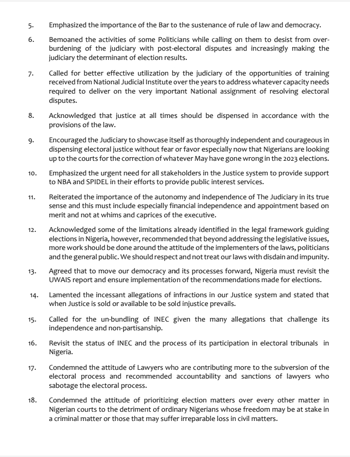 - Agreed that in the aftermath of the 2023 elections, there is a huge task of sustaining the trust and confidence of the general public in the judiciary and this can be achieved by ensuring that justice is served in the process of resolving electoral grievances currently before election tribunals.