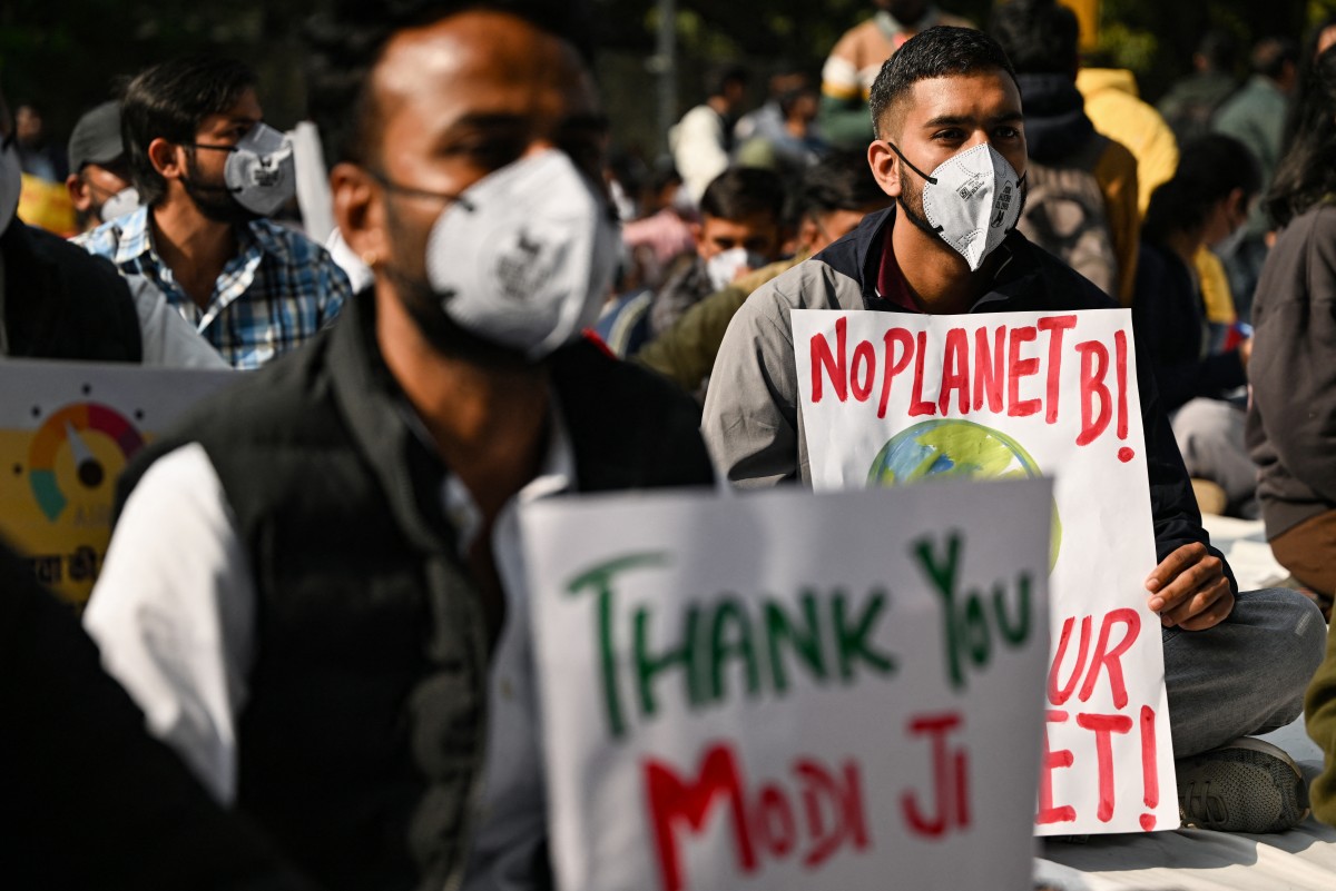 Demonstrators wearing masks hold posters during a protest demanding the government take action to reduce air pollution in New Delhi on December 3, 2025. (Photo by Sajjad HUSSAIN / AFP)