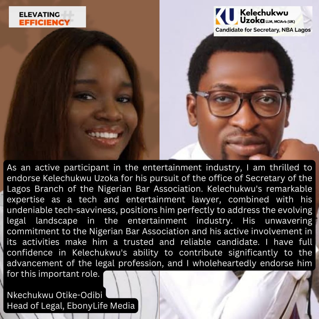 As an active participant in the entertainment industry, I am thrilled to endorse Kelechukwu Uzoka for his pursuit of the office of Secretary of the Lagos Branch of the Nigerian Bar Association. Kelechukwu’s remarkable expertise as a tech and entertainment lawyer, combined with his undeniable tech-savviness, positions him perfectly to address the evolving legal landscape in the entertainment industry. His unwavering commitment to the Nigerian Bar Association and his active involvement in its activities make him a trusted and reliable candidate. I have full confidence in Kelechukwu’s ability to contribute significantly to the advancement of the legal profession, and I wholeheartedly endorse him for this important role.