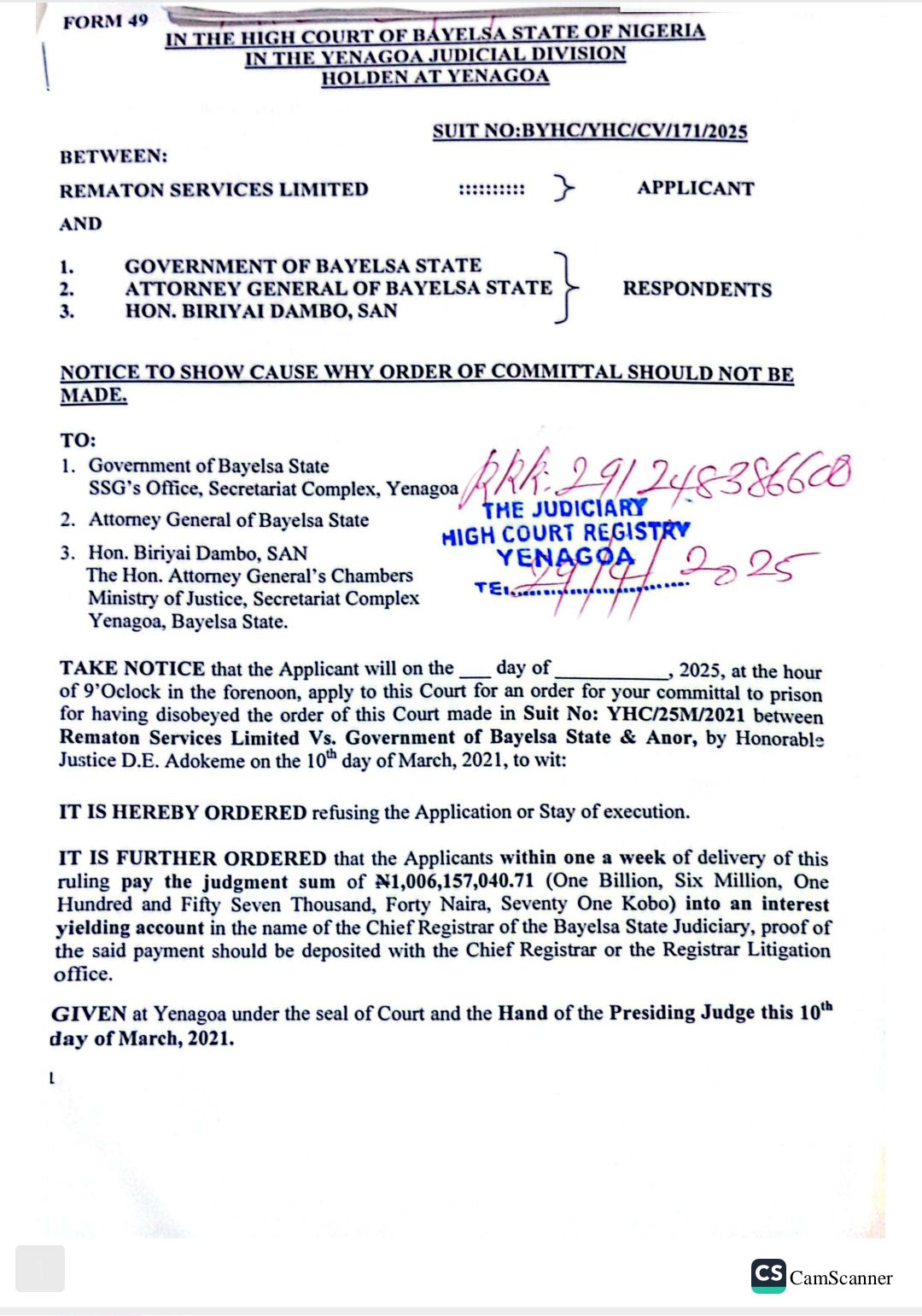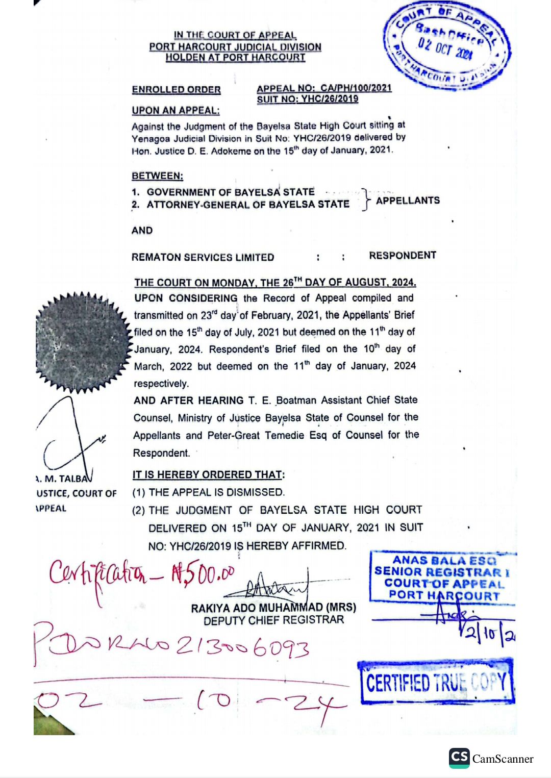In Suit No: YHC/26/2019, the High Court of Bayelsa State, per Hon. Justice D.E. Adokeme, on 15 January 2021, entered judgment in favour of REMATON SERVICES LIMITED, awarding the sum of ₦1,006,157,040.71, with 10% interest per annum until liquidation.