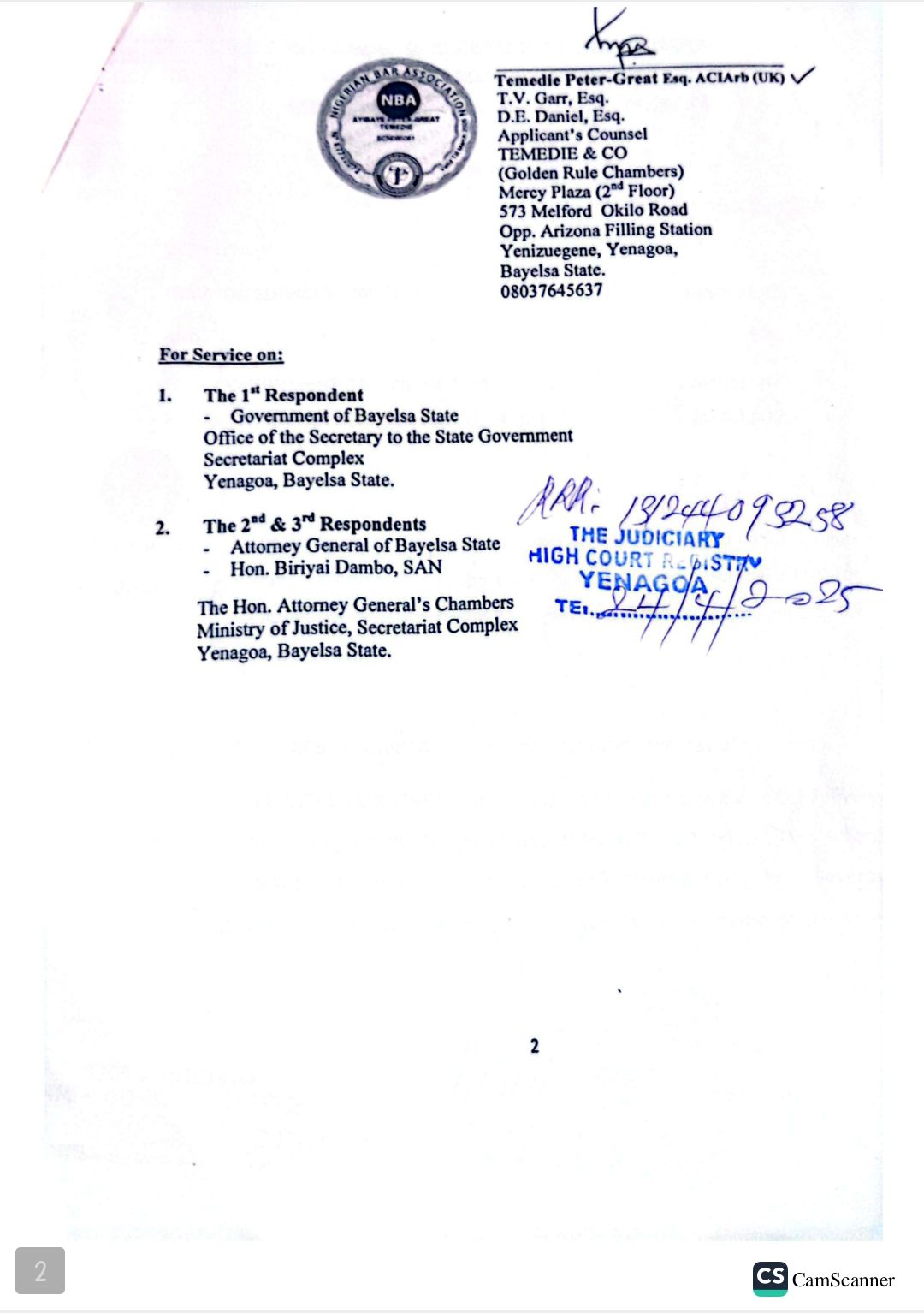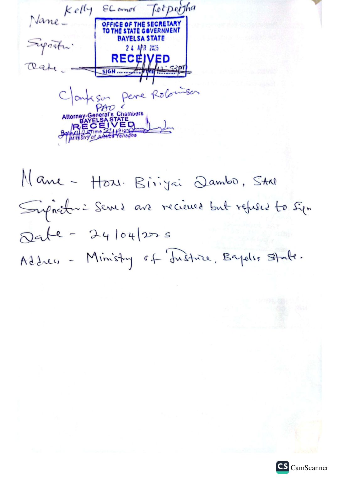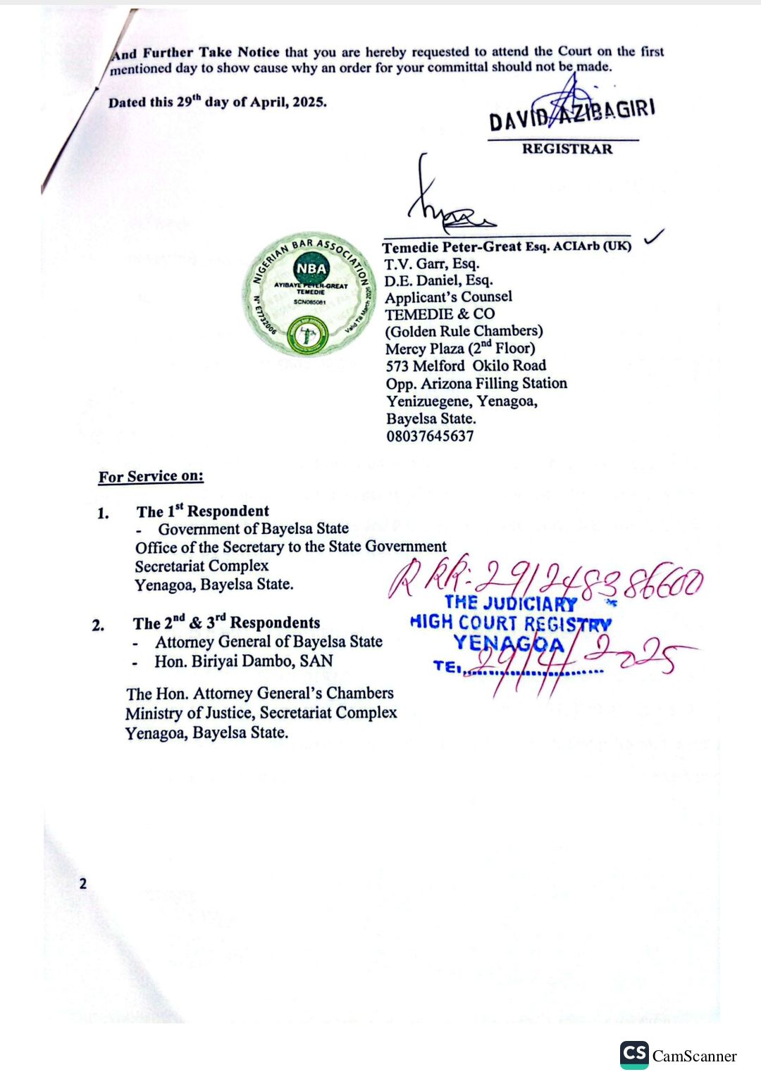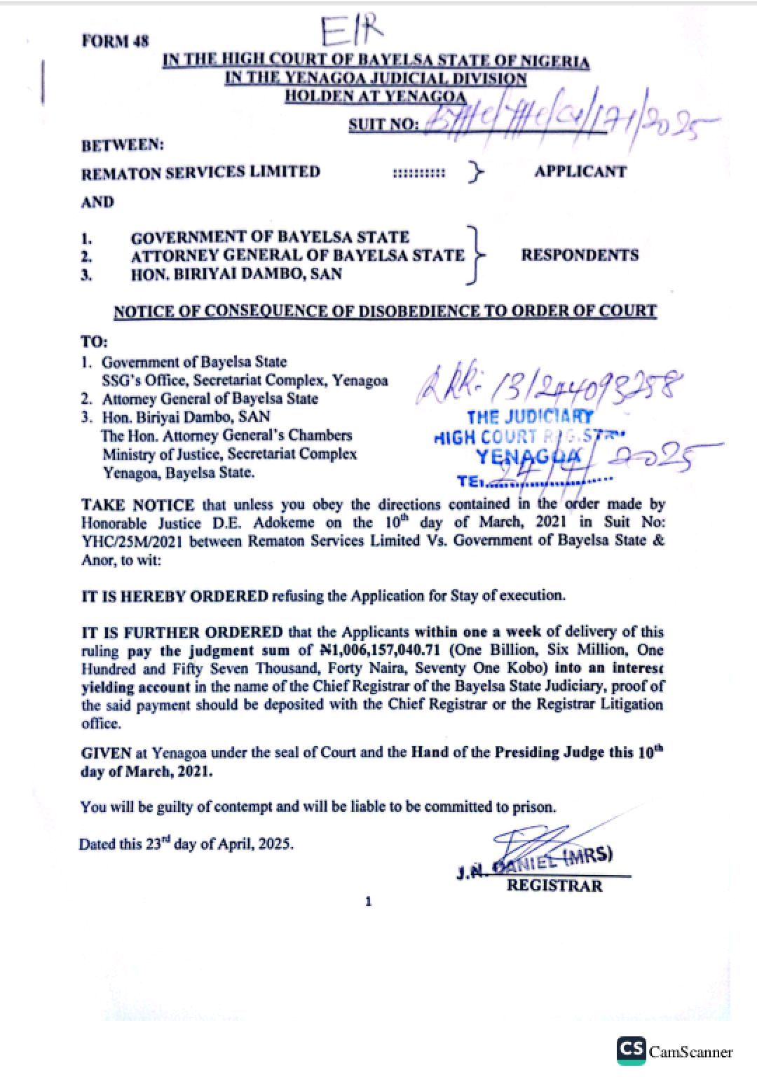 Rather than comply, the Bayelsa State Government—acting through the office of the Attorney-General, Biriyai Dambo, SAN—chose the path of procedural obstruction. A motion for stay of execution was filed and expressly refused. Instead, the Court ordered that the judgment sum be paid into an interest-yielding account in the name of the Chief Registrar of the Bayelsa State Judiciary within one week.