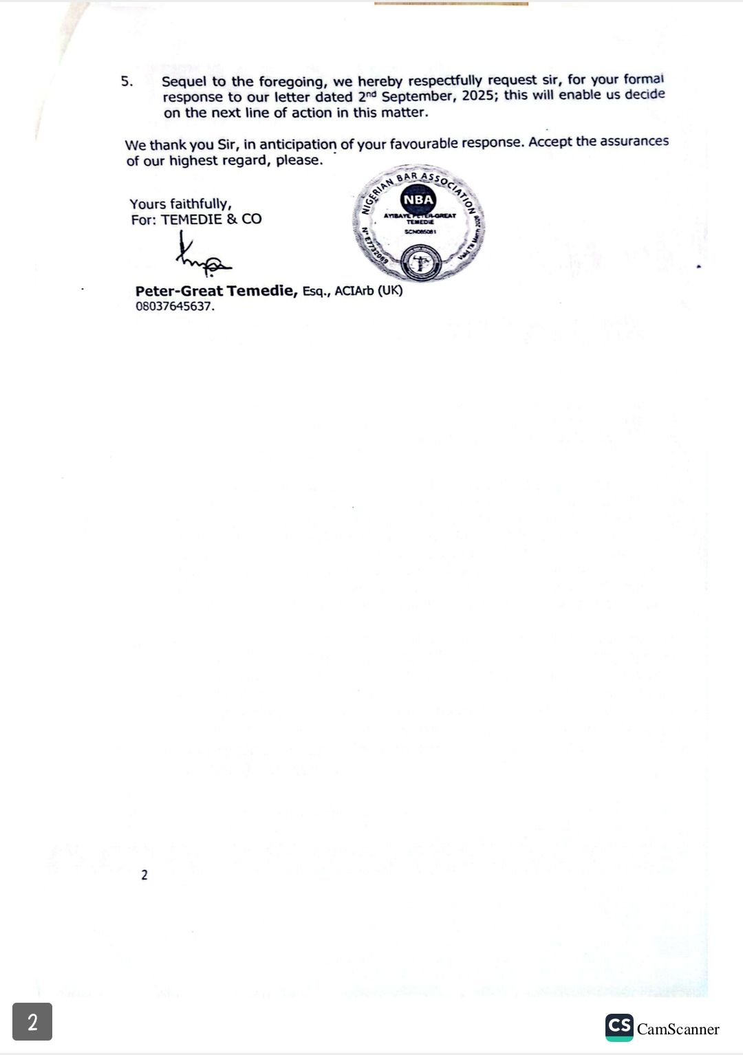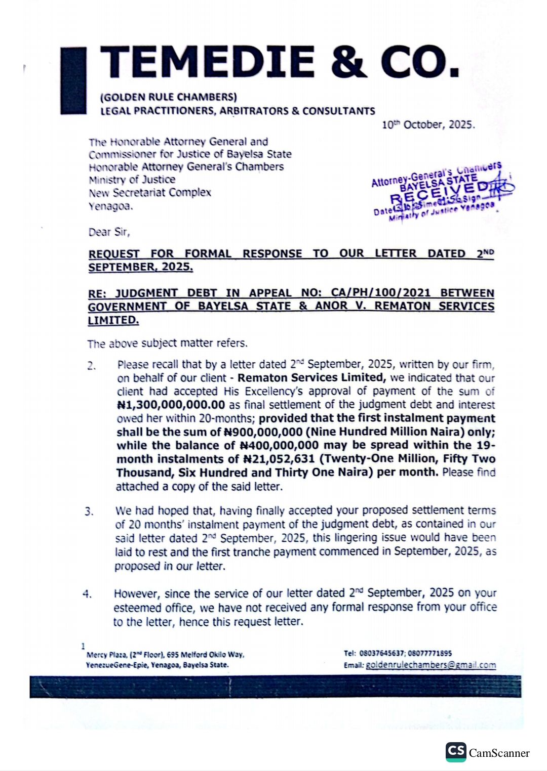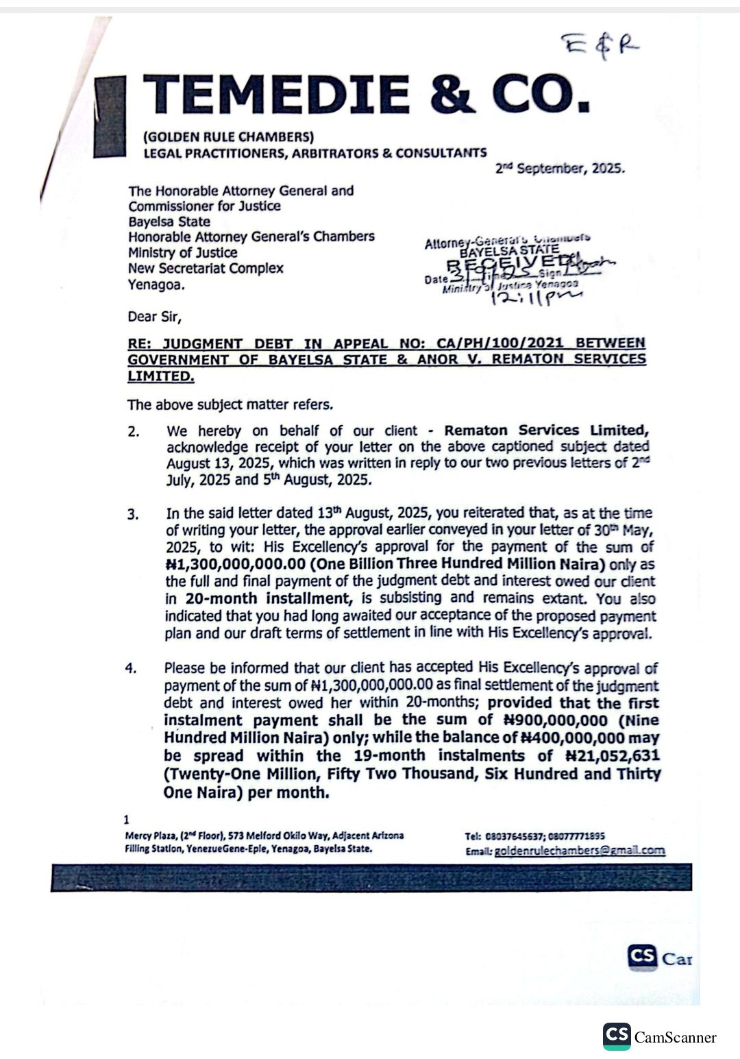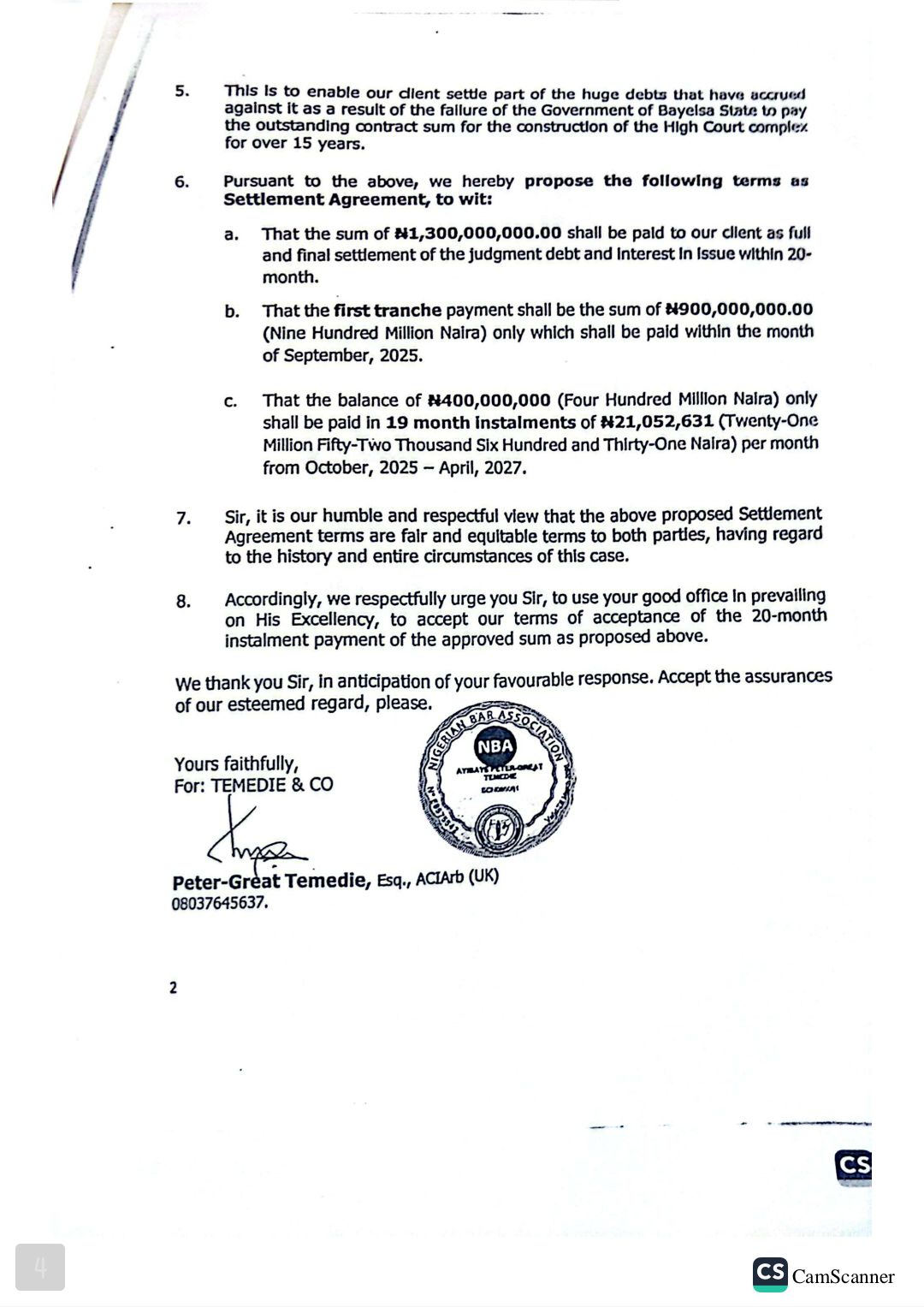 In correspondence dated 30 May 2025, the Respondents conveyed that His Excellency, Senator Douye Diri, Governor of Bayelsa State (Douye Diri), had approved ₦1.3 billion as full and final settlement, payable over 20 months, and requested a settlement agreement.