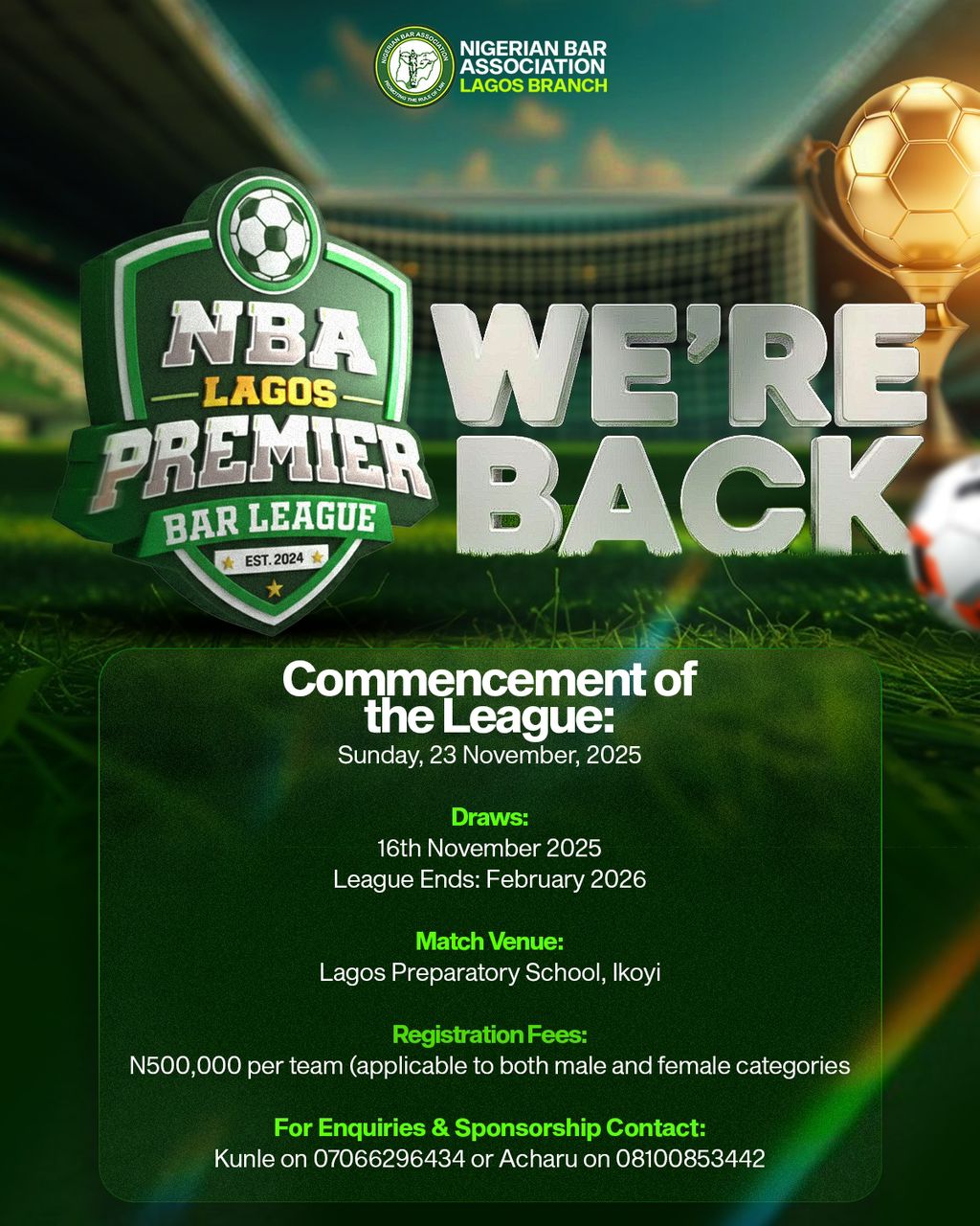 The Sport Committee of the NBA Lagos Branch, under the leadership of Mr. Adekunle Olaofe is excited to announce the commencement of the 2nd edition of the Premier Bar League Football Competition.