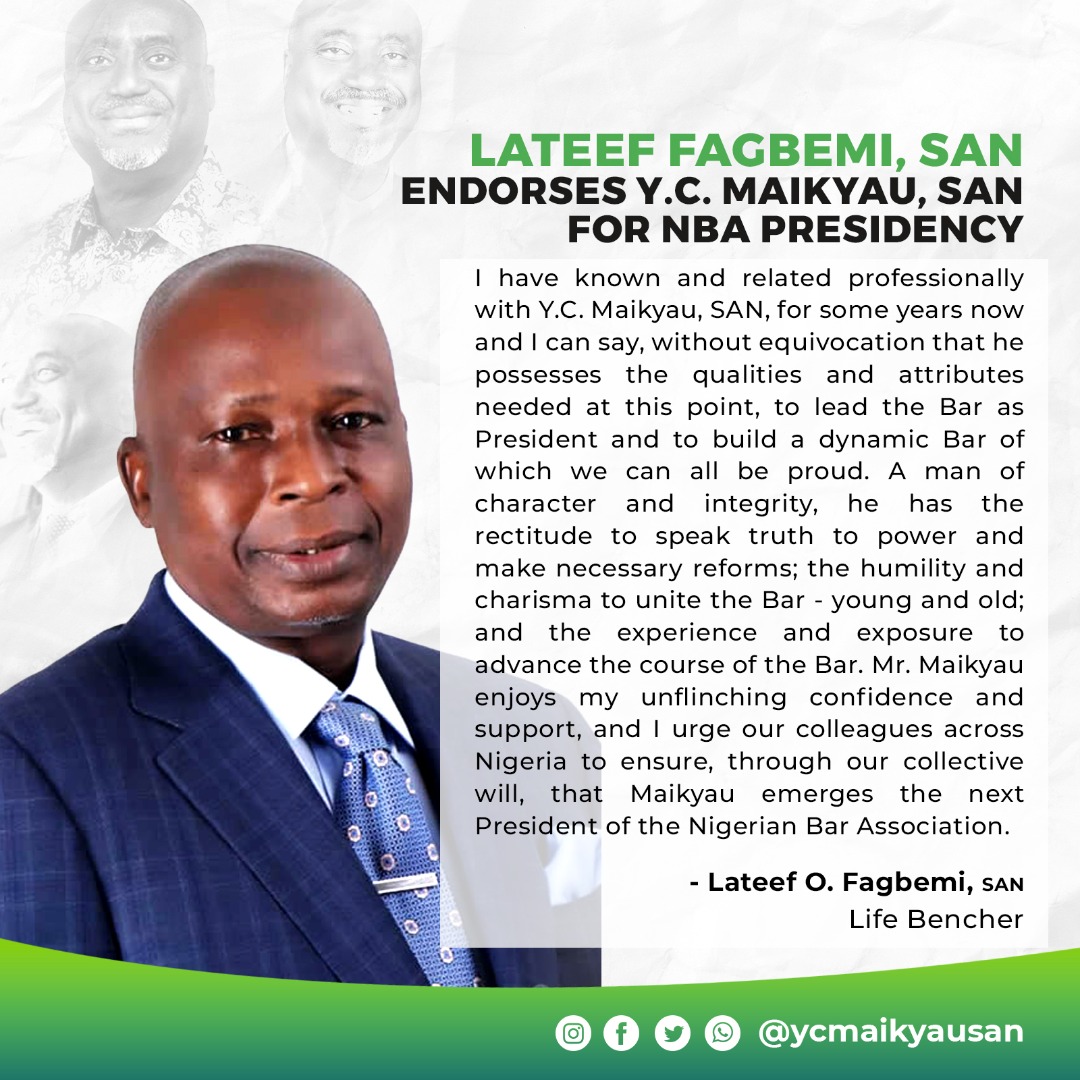 A man of character and integrity, he has the rectitude to speak truth to power and make necessary reforms; the humility and charisma to unite the Bar – young and old; and the experience and exposure to advance the course of the Bar. Mr. Maikyau enjoys my unflinching confidence and support, and I urge our colleagues across Nigeria to ensure, through our collective will, that Maikyau emerges the next President of the Nigerian Bar Association.