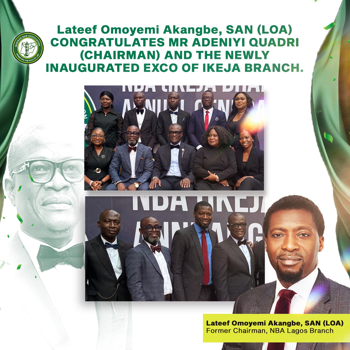 I extend my heartfelt congratulations to Mr Adeniyi Quadri (Chairman) Mr Deji Olanbiwonu (Secretary) and other members of the newly elected executives of the Nigerian Bar Association (NBA), Ikeja Branch.