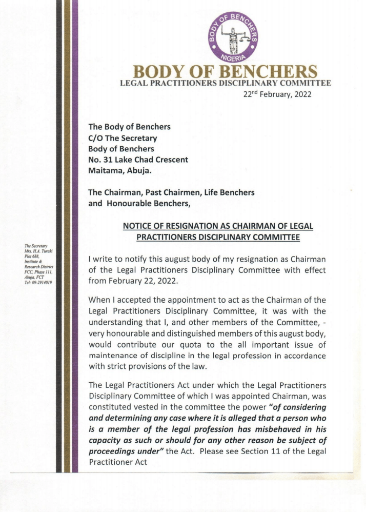 I write to notify this august body of my resignation as Chairman of the Legal Practitioners Disciplinary Committee with effect from February 22, 2022.