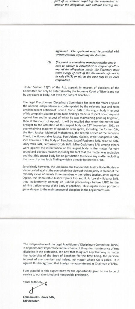 The Chairman of the Legal Practitioners Disciplinary Committee (LPDC), Emmanuel Ukala, SAN has resigned.