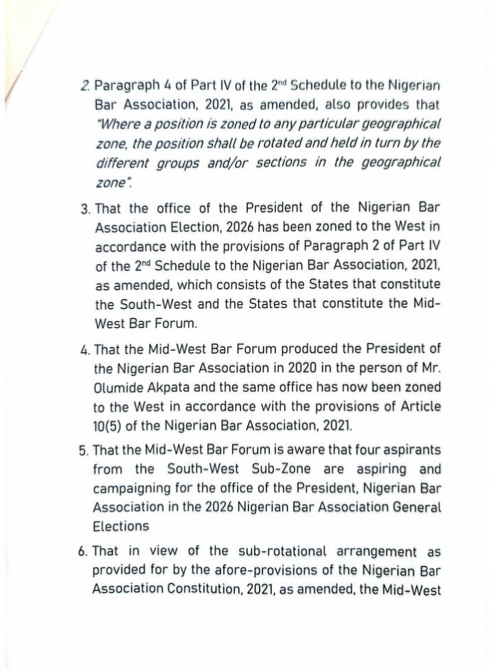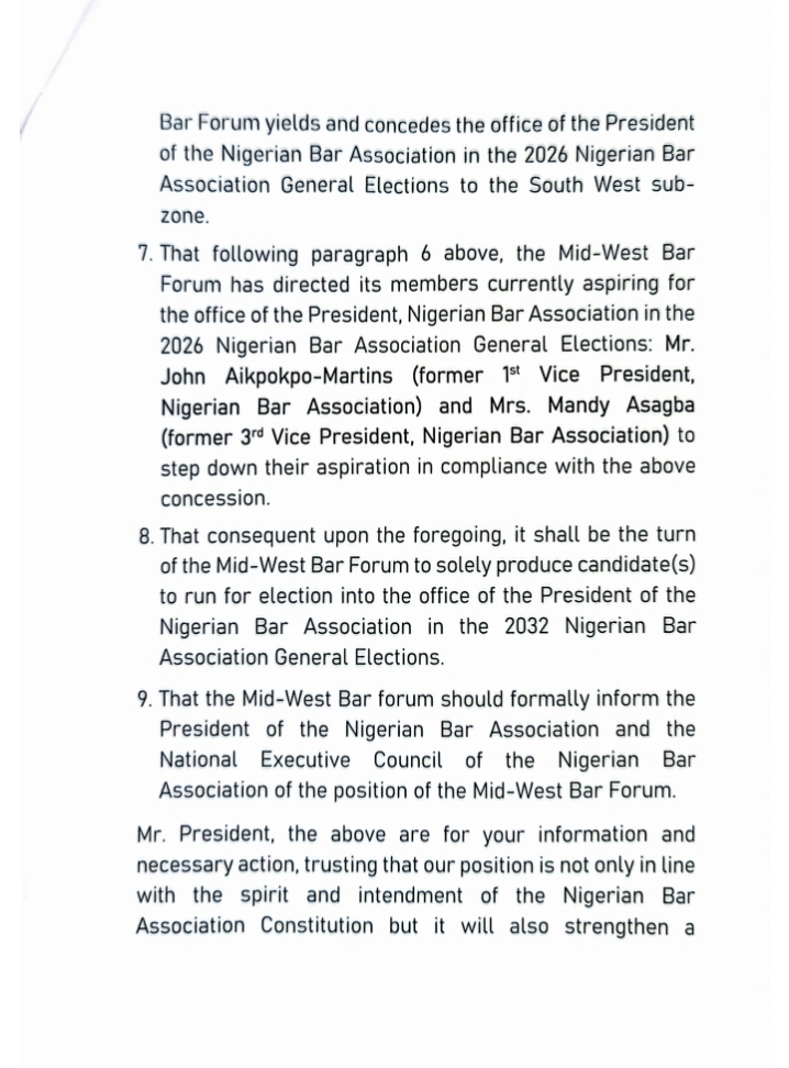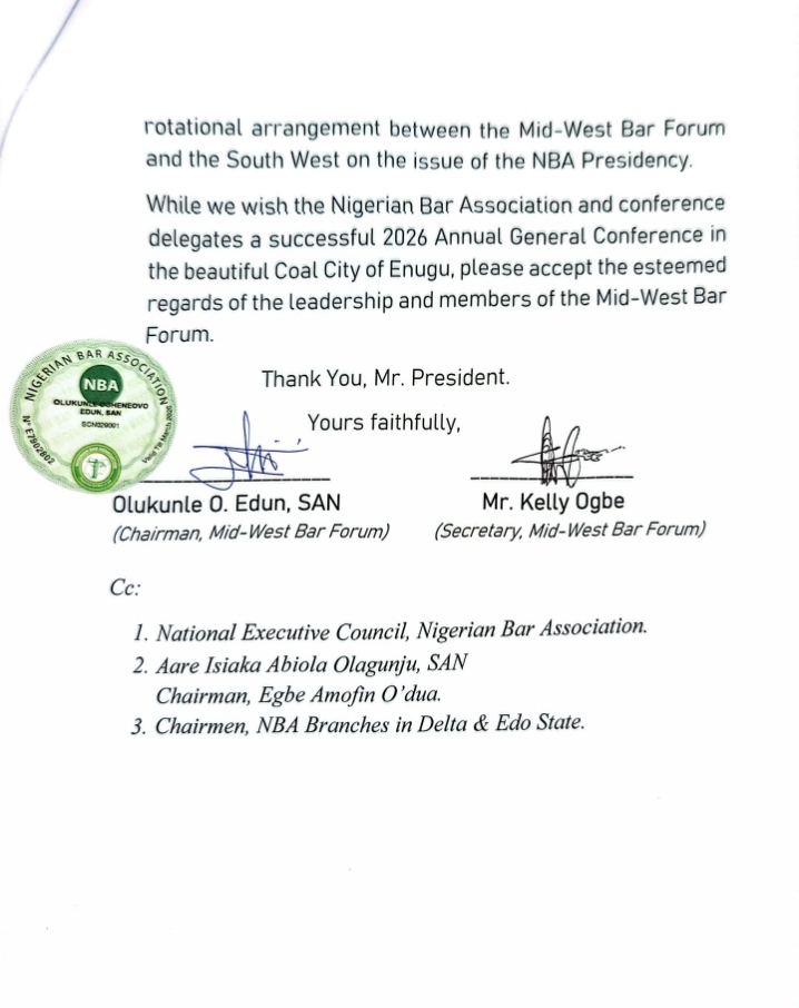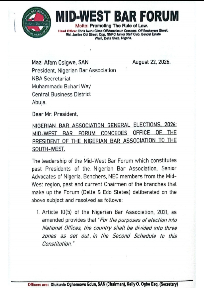 The Mid-West Bar Forum has formally conceded the office of the President of the Nigerian Bar Association (NBA) for the 2026 General Elections to the South-West.