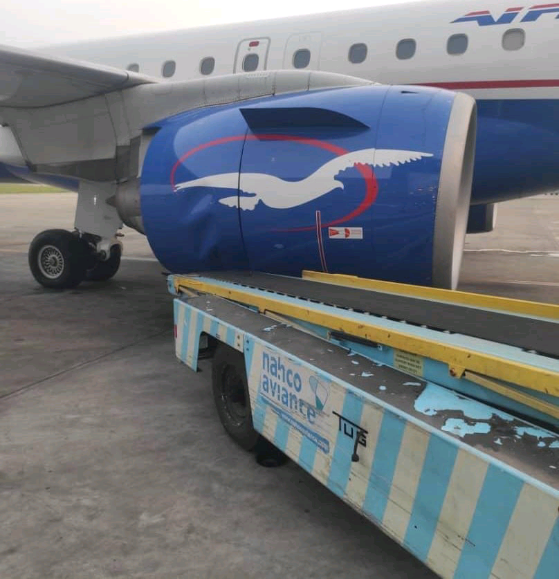 The airline confirmed the development in a statement, saying the incident occurred after passengers had boarded when a luggage conveyor belt vehicle operated by the Nigerian Aviation Handling Company collided with one of the aircraft’s engines.