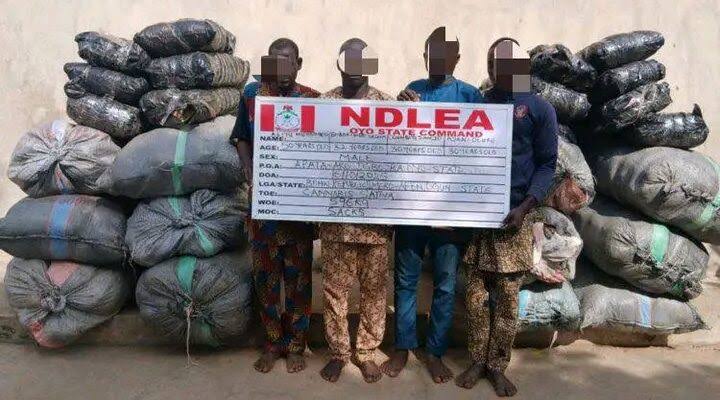 In Oyo State, NDLEA operatives arrested Aliyu Muhammed (50), Babarinde Segun (32), Ogunbiyi Sanjo (30), and Ajani Oluro (30) with 596 kilograms of skunk at Apata-Ako, Igboora.