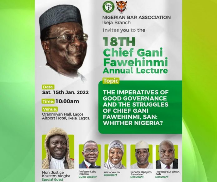 The Nigerian Bar Association, Ikeja branch invites the General Public to the 18th Chief Gani Fawehinmi Annual Lecture on Saturday, 15th January, 2022. The lecture holds annually with the aim of preserving the great legacies of Chief Gani Fawehinmi who was an author, publisher, philanthropist, social critic, human and civil rights lawyer.
