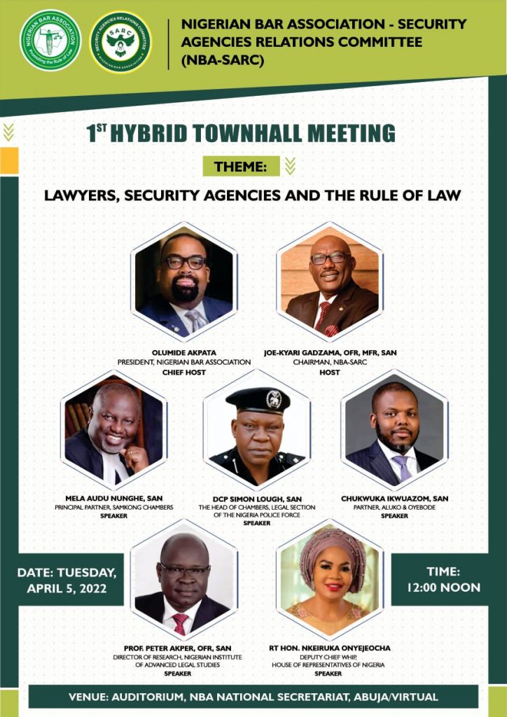 In line with the above-mentioned objective, the NBA-SARC will be organizing a Hybrid Townhall Meeting on the 5th day of April 2022 by Noon at the NBA Secretariat, Abuja. The theme of the Town Hall meeting is “Lawyers, Security Agencies and the Rule of Law”.