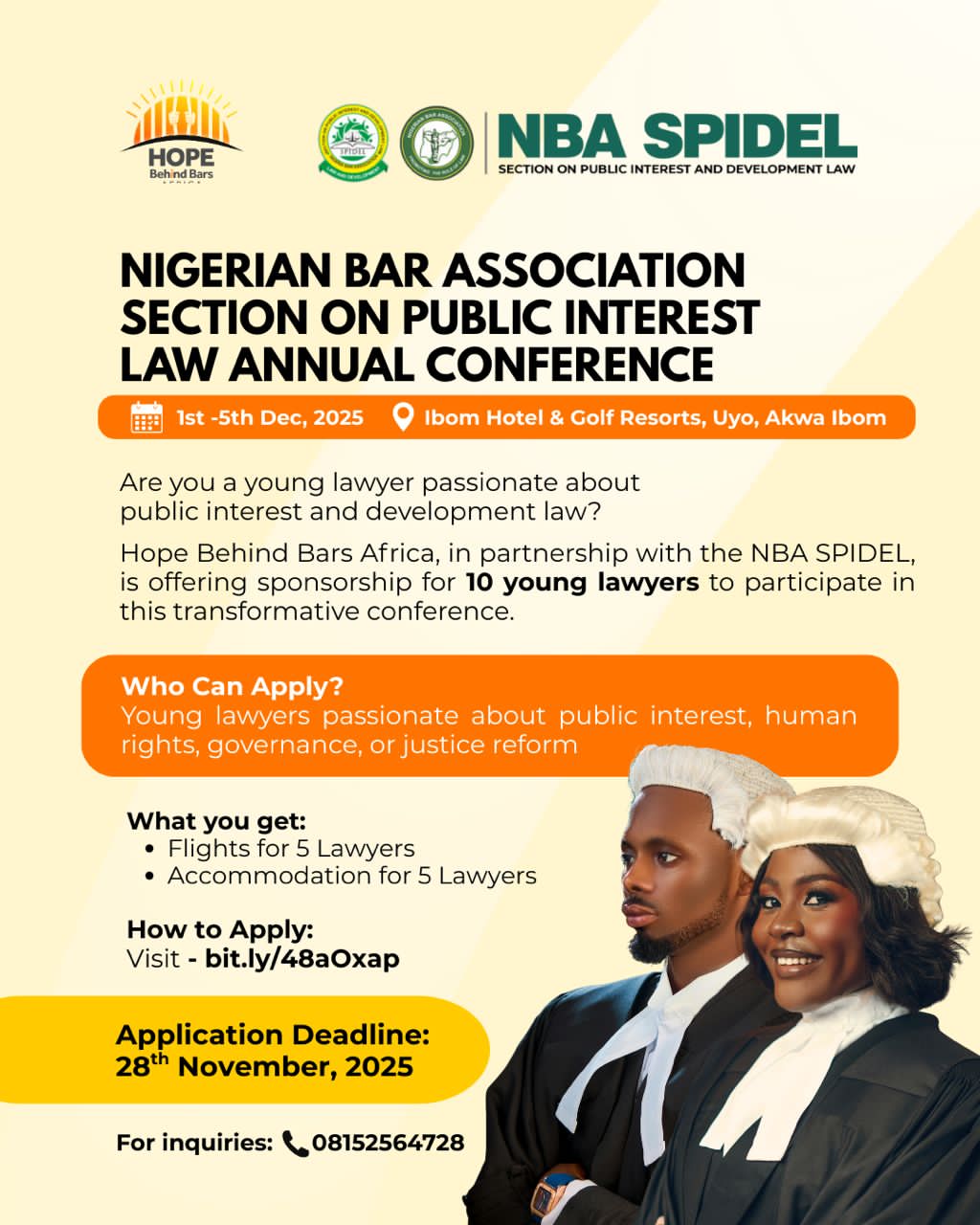 The Nigerian Bar Association Section on Public Interest and Development Law (NBA-SPIDEL) is set to sponsor 10 young lawyers to its eagerly awaited Annual Conference. The sponsorship is in collaboration with Hope Behind Bars, a major player in access to justice matters.