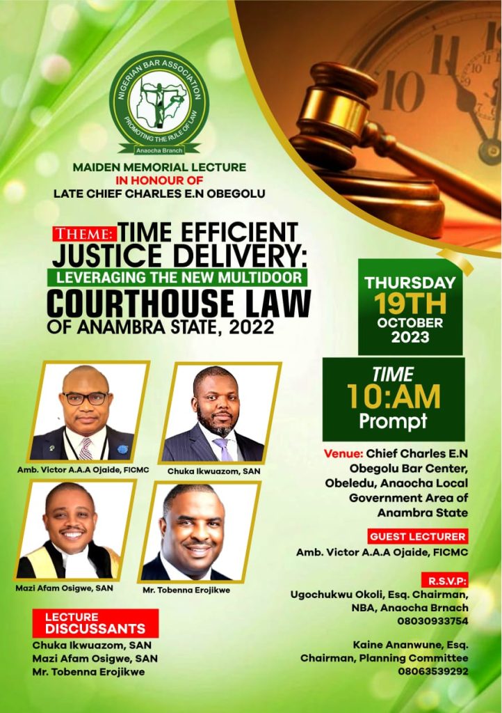 Nigerian Bar Association (NBA), Anaocha Branch, is scheduled to hold her maiden annual lecture in honour of Late Chief Charles E.N Obegolu on Thursday, the 19th day of October, 2023 at The Chief Charles E.N Obegolu Bar Center, Obeledu, Anaocha Local Government Council of Anambra State. Time:10 am.
