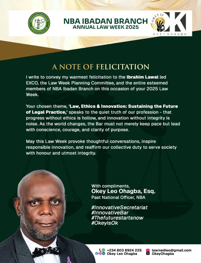 I write to convey my warmest felicitation to the Ibrahim Lawal led EXCO, the Law Week Planning Committee, and the entire esteemed members of NBA Ibadan Branch on this occasion of your 2025 Law Week.