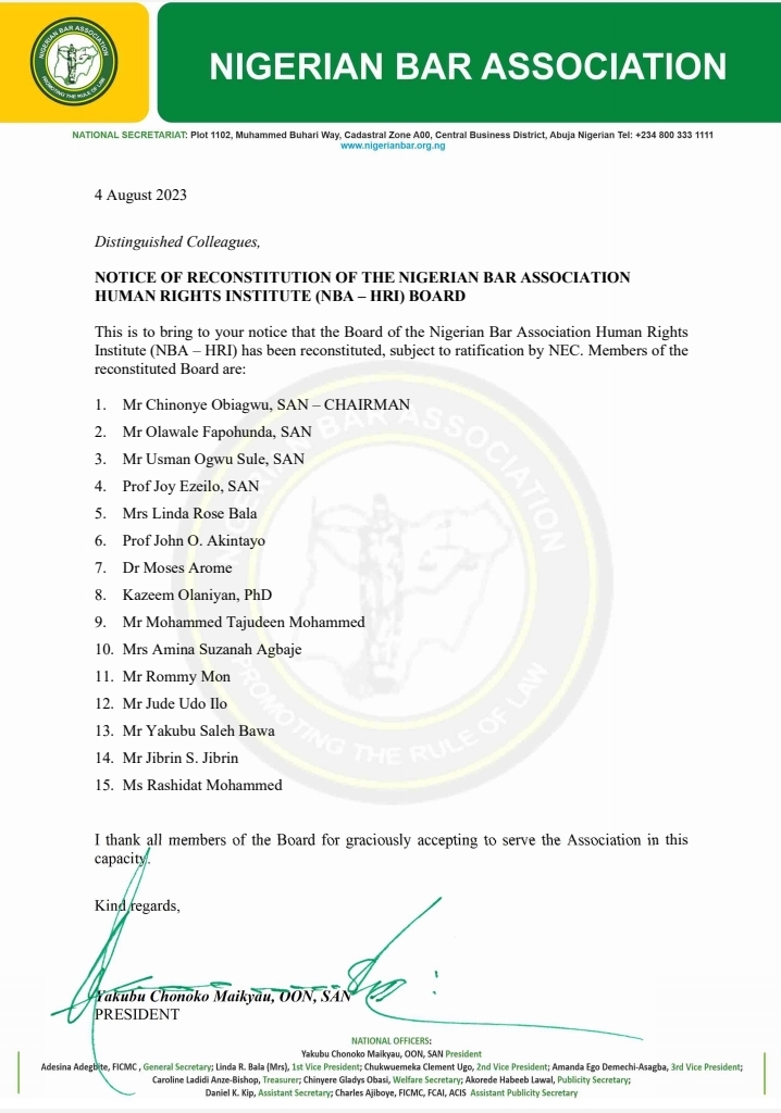 This is to bring to your notice that the Board of the Nigerian Bar Association Human Rights Institute (NBA – HRI) has been reconstituted, subject to ratification by NEC. Members of the