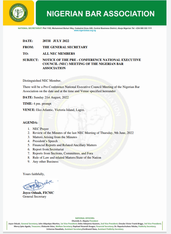 SUBJECT: NOTICE OF THE PRE – CONFERENCE NATIONAL EXECUTIVE COUNCIL (NEC) MEETING OF THE NIGERIAN BAR ASSOCIATION