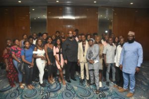 Olumide Akpata with some of the beneficiaries for the Give-Away Concert Tickets at the Transcorp Hilton Hotel, Abuja