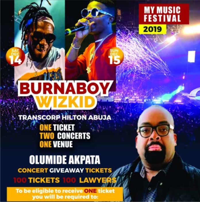 In recognition of the increasing importance of the entertainment industry to the Nigerian economy, Olumide Akpata will be giving away 100 free tickets to lawyers to attend the Burna Boy and WizKid Concerts at Transcorp Hilton Hotel, Abuja on Saturday 14th and Sunday 15th December 2019, respectively.