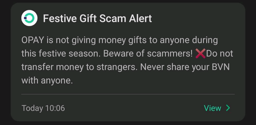 The statement read, “Opay is not giving money to anyone during this festive season. Beware of scammers, do not transfer money to strangers, never share your BVN to anyone.”