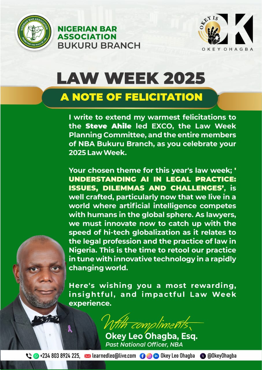 I write to extend my warmest felicitations to the Steve Ahile led EXCO, the Law Week Planning Committee, and the entire members of NBA Bukuru Branch, as you celebrate your 2025 Law Week.