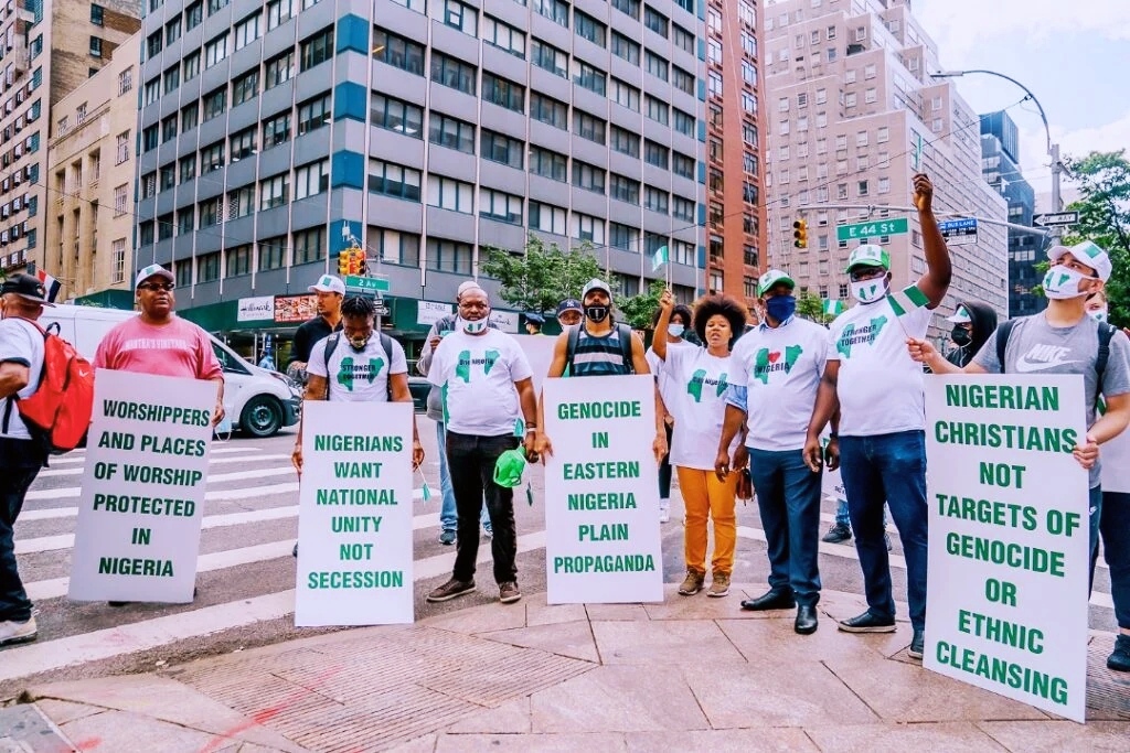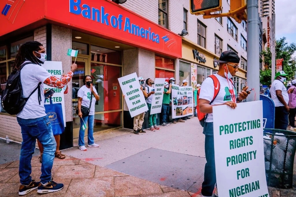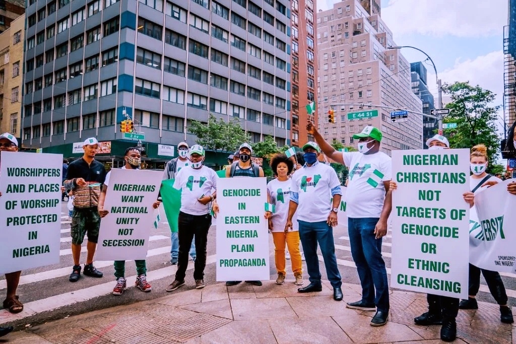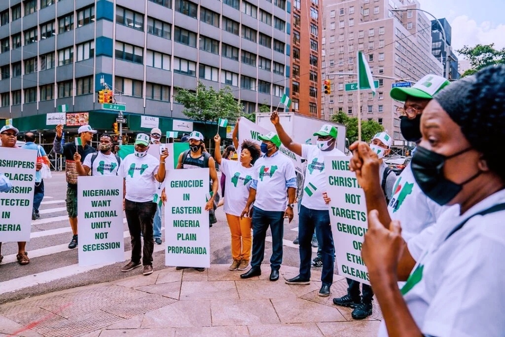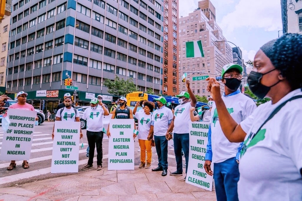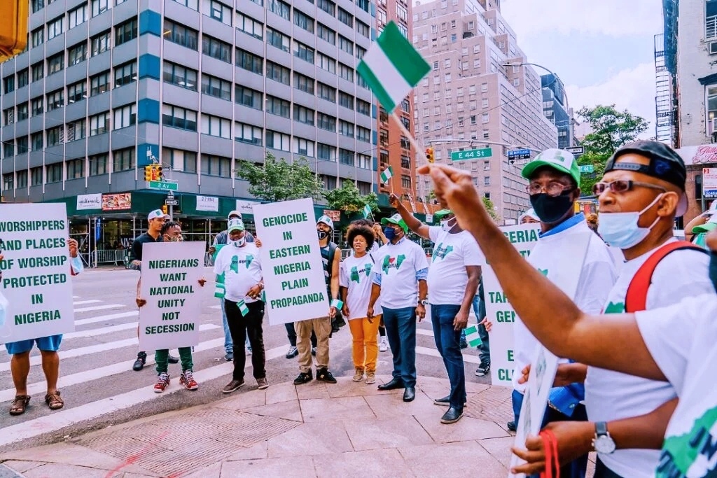 The protesters converged near the United Nations Secretariat ahead of the UN general assembly (UNGA) which is expected to commence on Tuesday.President Buhari is in New York for the UNGA and will address the assembly on Friday, September 24.Some of the protesters held placards with inscriptions such as ‘Nigerians want national unity, not secession’, ‘Genocide in eastern Nigeria plain propaganda’, among others.