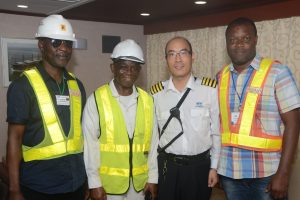 L-R: Abdulrasaq Olatunji, Stevedore Supervisor, Ports & Cargo Handling Services Limited; Dickson Oyiadjo, MV Maritime Challenger Port Captain and IMC Shipping Representative in Africa; Tang Jiang Tao, Captain, MV Maritime Challenger and Mr. Daniel Jemiluyi, Ports Operations Manager, Ports & Cargo Handling Services Limited at the maiden call of MV Maritime Challenger (brand new vessel) at the Ports & Cargo Handling Services Terminal, Tin Can Island Port, Apapa.