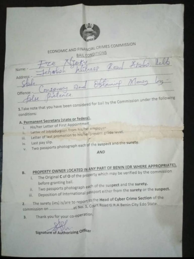 23.That the Condition for Bail given by the EFCC Benin Zonal Office is that Eze Njoku should bring a Federal or State Civil Servant that is a Permanent Secretary and a House Owner that has a Certificate of Occupancy.