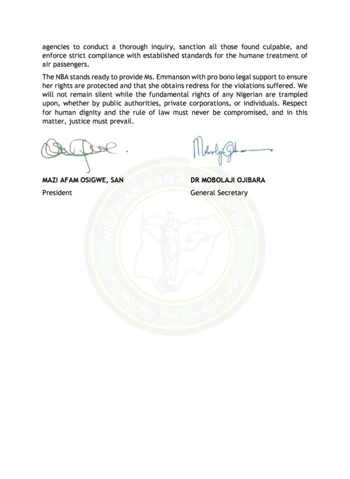 The NBA demands that Ibom Air immediately withdraw the lifetime ban, issue a public apology to Ms. Emmanson, and cooperate fully with an impartial investigation into this incident. We also call on the Minister for Aviation, the Nigerian Civil Aviation Authority, the Federal Airports Authority of Nigeria, and relevant security agencies to conduct a thorough inquiry, sanction all those found culpable, and enforce strict compliance with established standards for the humane treatment of air passengers.