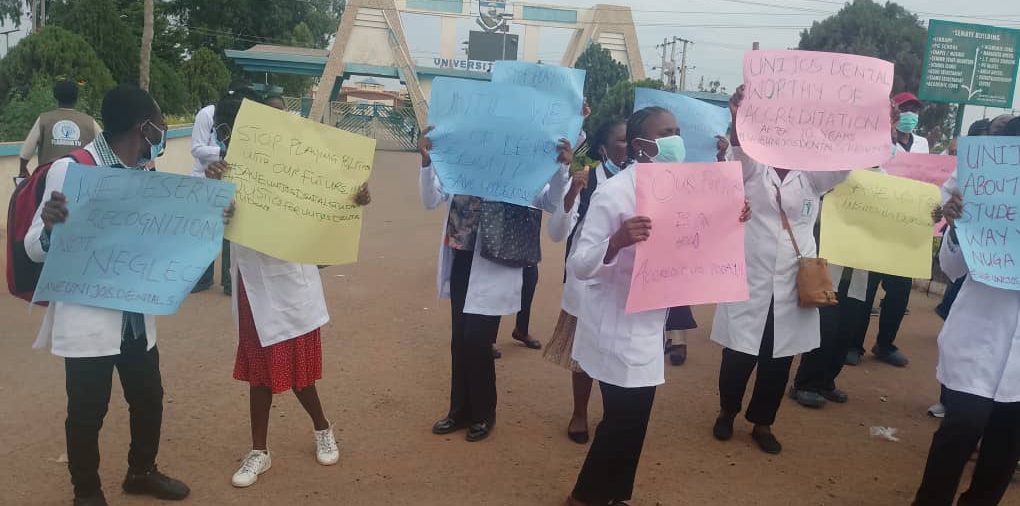 Dozens of University of Jos dental students have taken to the streets to protest the non-accreditation of their courses, which has resulted in them spending over ten years in school without graduating.