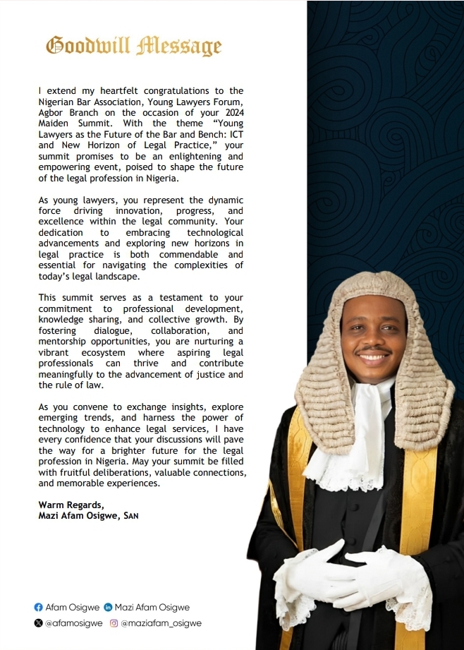 I extend my heartfelt congratulations to the Nigerian Bar Association, Young Lawyers Forum, Agbor Branch on the occasion of your 2024 Maiden Summit. With the theme “Young Lawyers as the Future of the Bar and Bench: ICT and New Horizon of Legal Practice,” your summit promises to be an enlightening and empowering event, poised to shape the future of the legal profession in Nigeria.